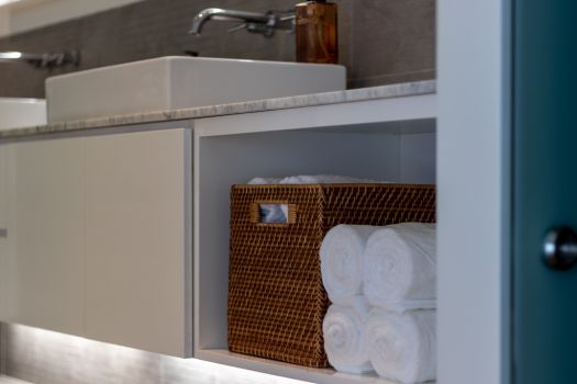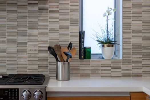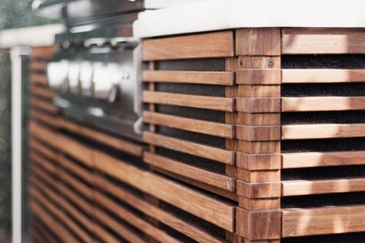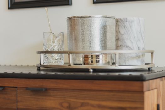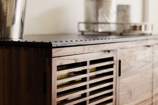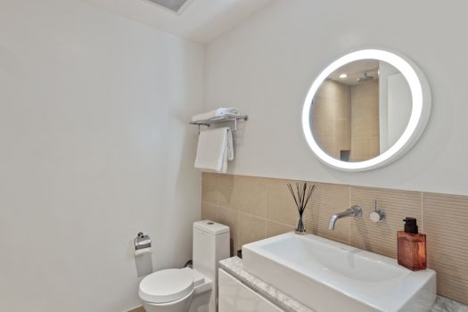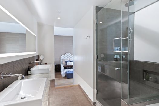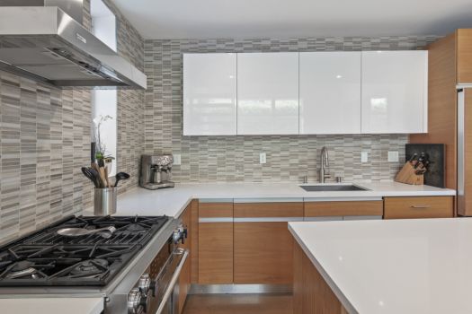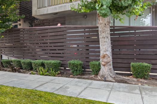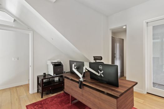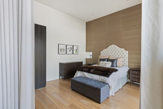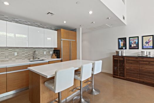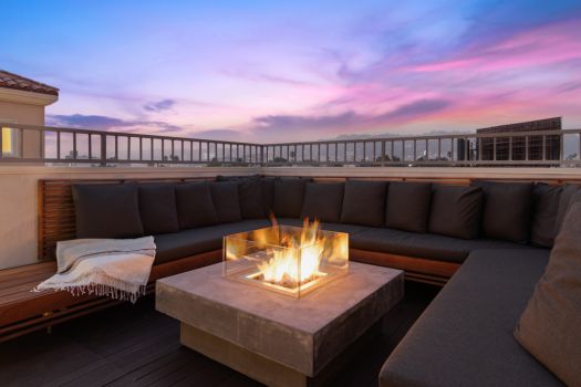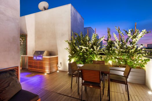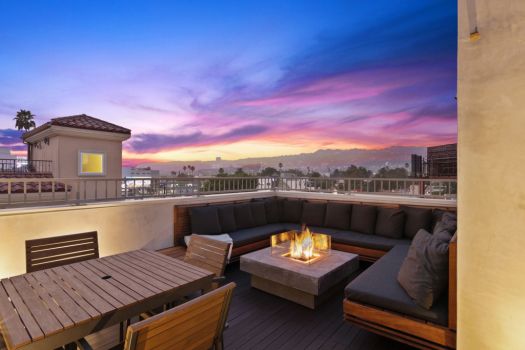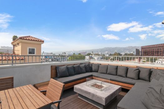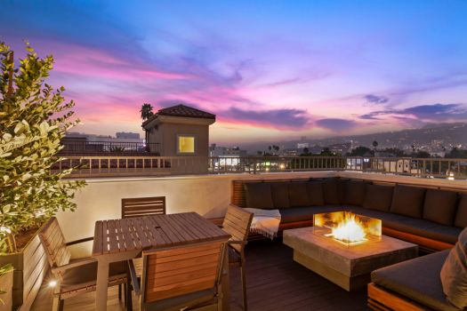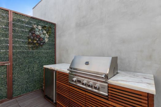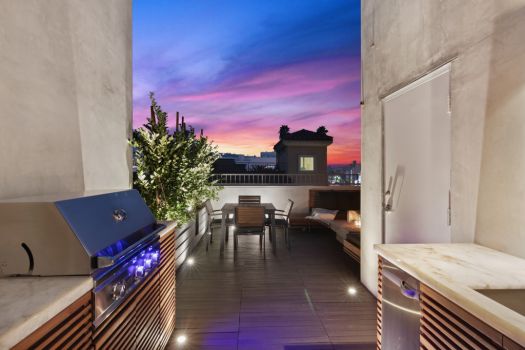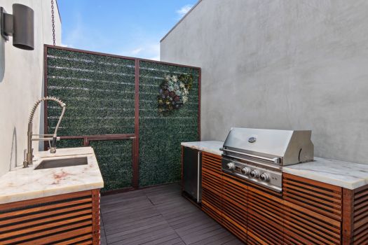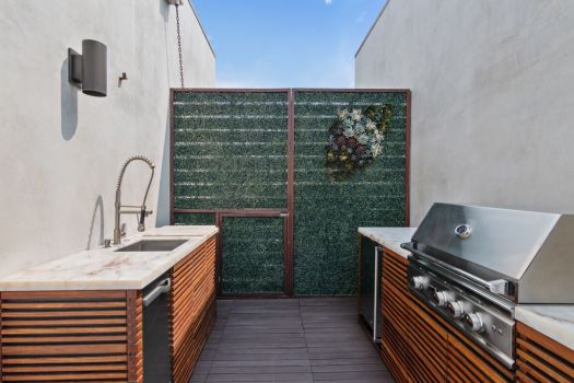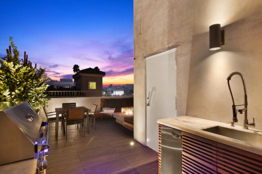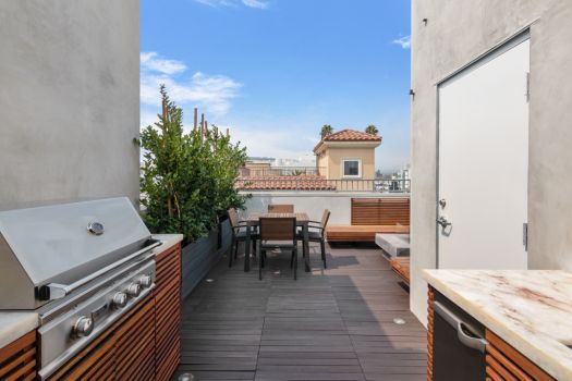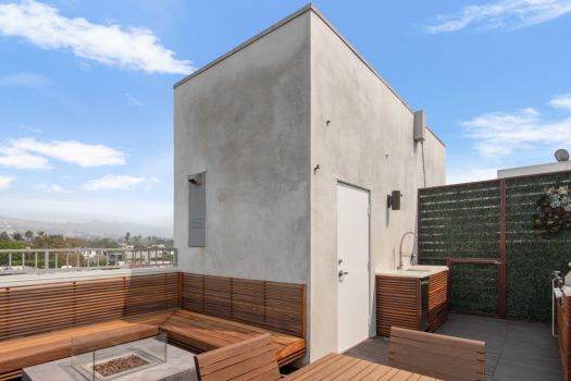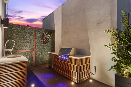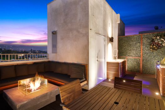 The private rooftop provides towering 270-degree views of the Hollywood Hills and city lights, and features an outdoor kitchen with natural quartzite countertops, top of the line gas grill, sink, two refrigerators, a gourmet “top hat” ice machine, and ample outdoor seating - all handcrafted in beautiful, sustainably sourced, Brazilian Walnut. Lush Privet shrubs and adjustable “up lighting” throughout, combine to provide the perfect private sanctuary for enjoying a sunny California afternoon, an intimate dinner, or a gathering with friends around the fire pit.