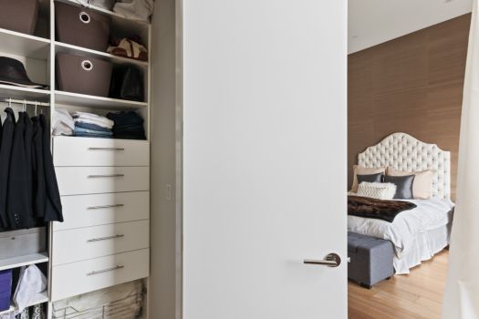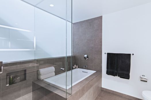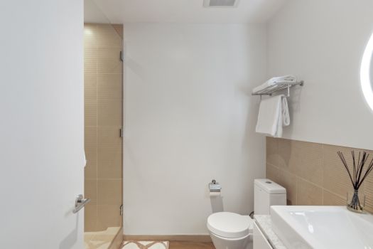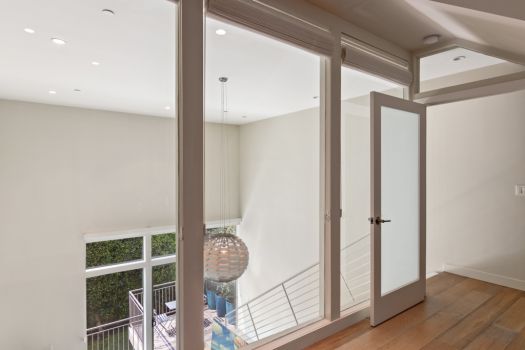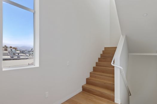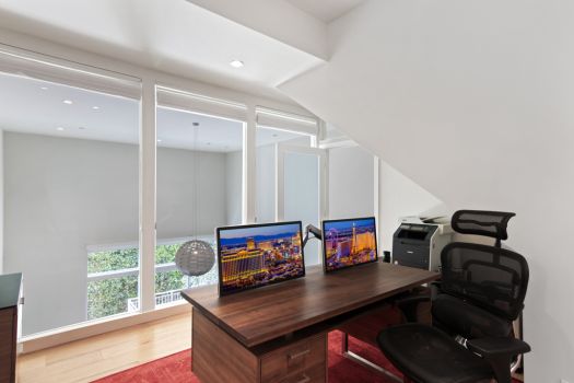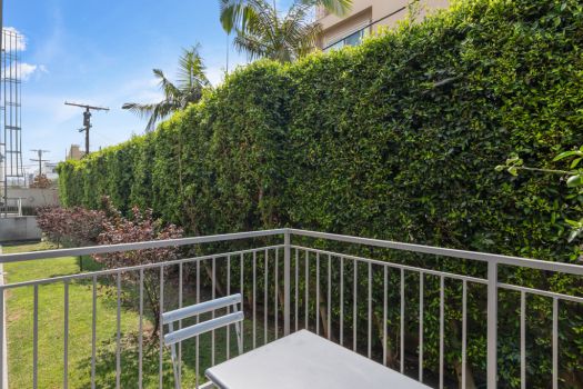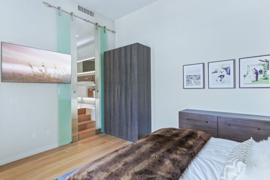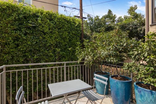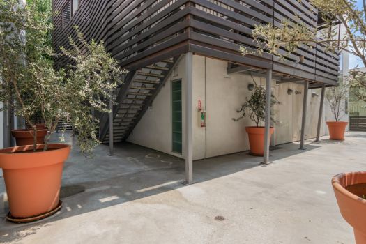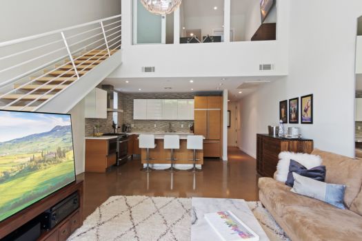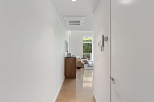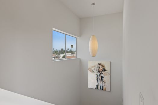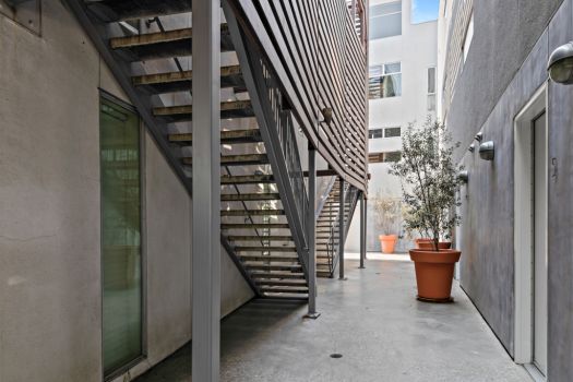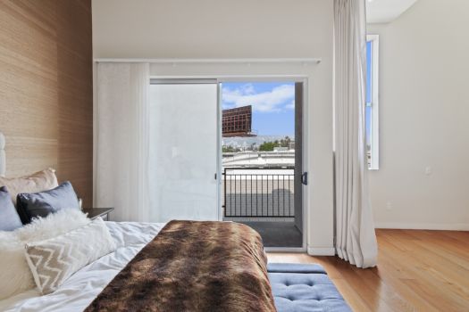 The main level has warm, glazed terrazzo floors and the upper levels feature wide plank, white oak flooring. The primary bedroom has expansive 12-foot ceilings and a balcony with views of the Hollywood Hills. The en suite bathroom has a massive dual sink vanity with a backlit mirror, Carrera marble countertops and designer fixtures. The second bedroom has striking views into the main living area and adjacent greenspace, but also has window coverings, when privacy is desired. The second bedroom is spacious enough to accommodate a king size bed, or an excellent place to spend your day if you work from home. The unit also a dual zone AC system, with a Nest thermostat, and an exterior storage closet containing custom shelving.