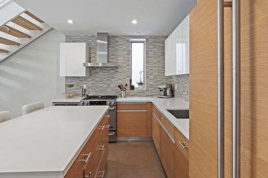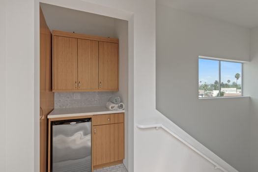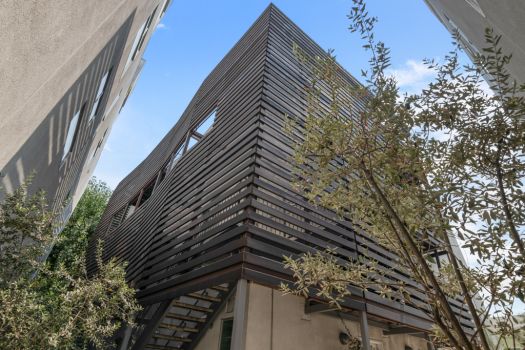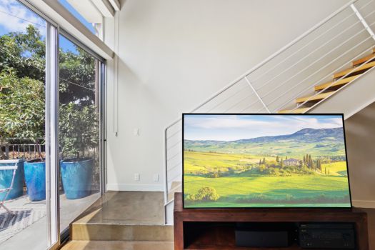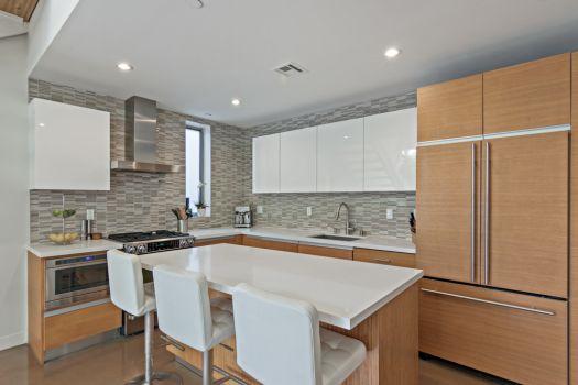 Incredible contemporary corner townhome, in a one of a kind architectural building, designed by award-winning architects, Pugh + Scarpa. This spacious two-bedroom, two-bath unit is spread across four levels, with private outdoor space on every level and a truly unique rooftop experience (1,900 square feet combined), which provides for seamless indoor, outdoor California living at its finest. The main living space is open to the chef’s kitchen and has stunning 20-foot ceilings, where glass sliders open to a private breakfast veranda encased in privacy hedges, creating a wonderfully open, bright and natural living area. The kitchen features ultra-modern design, ample storage, custom cabinetry and high-end Bosch and Jenn-Air appliances.